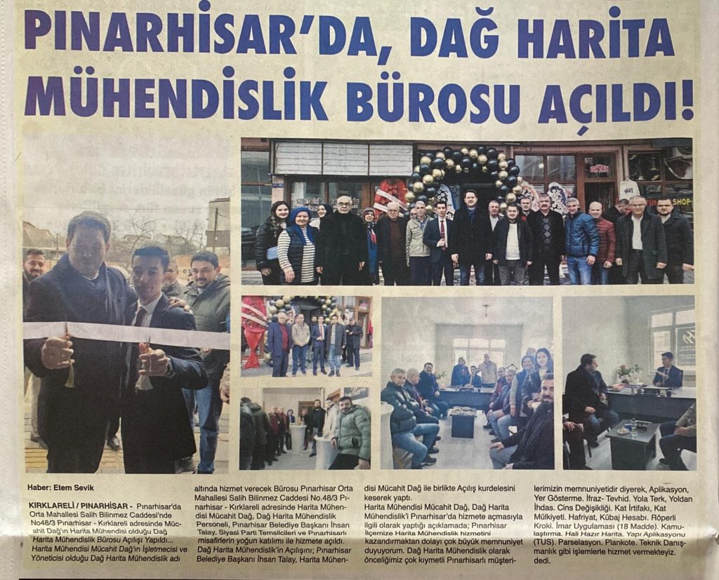 Açılışımızın ardından güzel bir çalışma ile hem Pınarhisar’ımıza hizmet ediyor hem de onlardan çok güzel dönüşler alıyoruz. Herhangi bir harita hizmeti hakkında her zaman bizleri arayıp, danışabilirsiniz. Sizlere hizmet etmekten büyük onur duyarız.